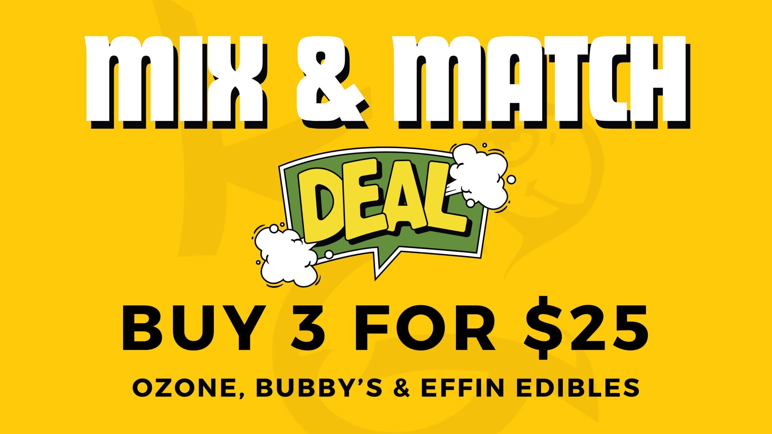 Mix & Match Ozone Edibles, Bubby’s Baked & Effin Edibles 3x for $25 Inventory may vary at our Brockton & Cambridge Dispensary.